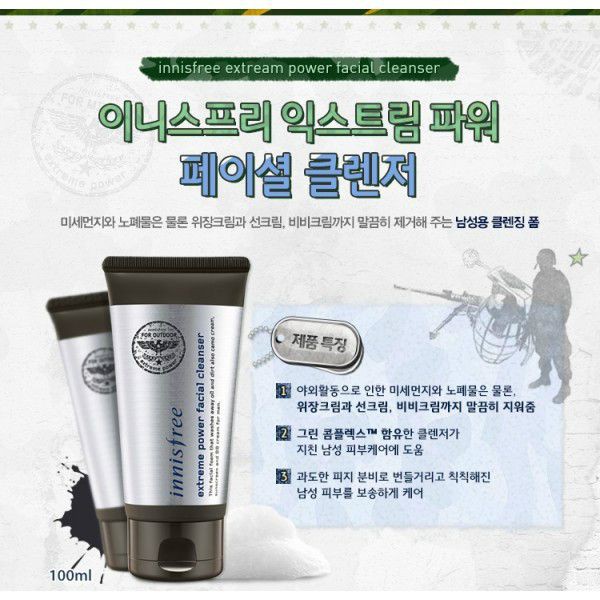Innisfree Extreme Power Facial Cleanser được sáng chế dành riêng cho nam giới, thông thường các lớp tế bào của nam sẽ dày hơn so với nữ, do thường xuyên vận động các tuyến mồ hôi tiết ra nhiều hơn đồng thời bụi bẩn dễ dàng bám vào da phát sinh mụn, nhờn rít, sạm da, lỗ chân lông to,…